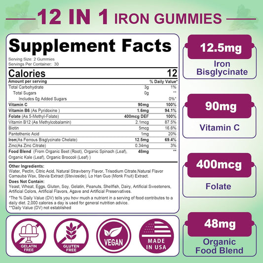 High Absorption Vegan Iron Gummies with Vitamin C, B-Complex, Folate - Iron Filled Supplement for Energy & Blood Building - 60Cts