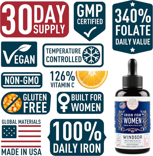 WINDSOR BOTANICALS Liquid Iron Supplement with Folic Acid and Vitamin C - Vegan Blood Builder and Anemia Support - 2 oz Orange Flavor Iron Drops for Women