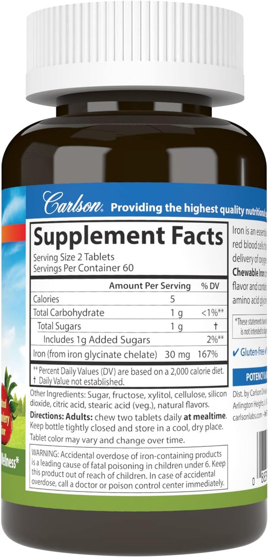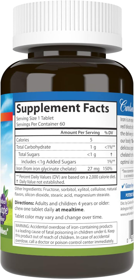 Carlson Chewable Iron Tablets - 27 mg, Superior Absorption for Blood Health & Energy Production - Grape Flavor, 60 Count