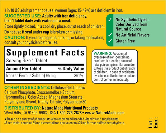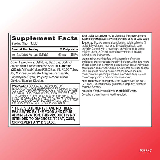 Iron 65 mg Supplement with Ferrous Sulfate for Red Blood Cell Support - 180 Tablets