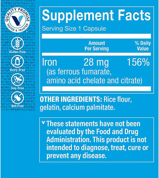 Iron 28MG Capsules - Essential Mineral for Immune Health & Energy Production - Highly Absorbable Form - Daily Supplement (300 Count)
