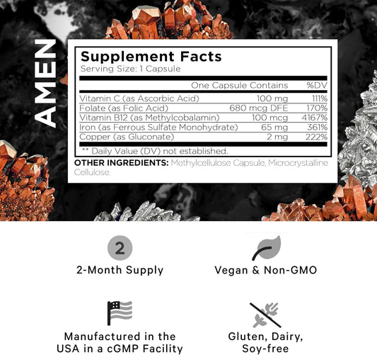 Iron Ultra Supplement with Copper, Folate, Vitamin C, and B12 - 2-Month Supply - 65mg Iron Per Serving - Non-GMO Iron Pills - 60 Capsules