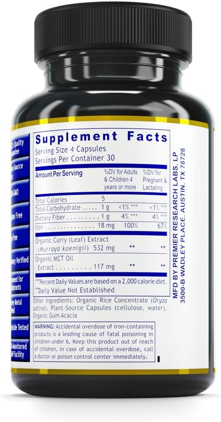 Plant-Based Iron Supplement for Men & Women - Premier Research Labs Phyto-Iron with Curry Leaves, Non-Heme Iron, 18mg Per Serving - 120 Vegetarian Capsules for Blood Support