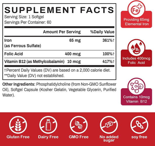 Liposomal Fe Iron Supplement for Women & Men - 65mg with Folic Acid & Vitamin B12 - Red Blood Cell Production & Energy Support - 60 Softgels - 2 Bottles