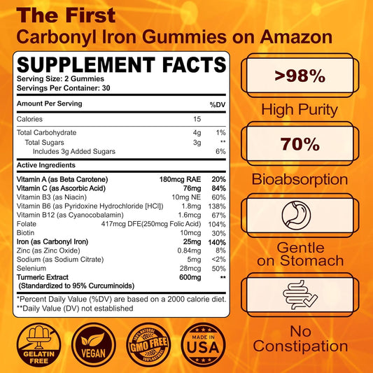 Iron Gummies for Women and Men - Non-Constipating 25mg Gentle Iron Supplement with Turmeric, Vitamin C, B12, Folate - Vegan and Tasty - 2 Pack