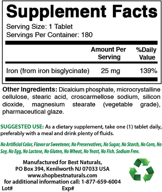 Gentle Iron Bisglycinate Supplement - 25mg - 180 Tablets - Non-Constipating Formula for Sensitive Stomachs
