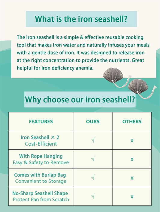 Iron Seashell 2-Pack with Bag - Natural Iron Source for Deficiency Risk Reduction, Safe Cooking Tool for Pregnant Women, Vegans, Athletes