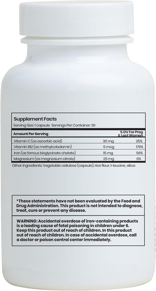 Iron Ease Daily Supplement - 15mg Iron Capsules with Vitamin C & Magnesium - For Women, New Mothers, & Men - Non GMO, Dairy/Gluten/Soy Free - 30 Pills