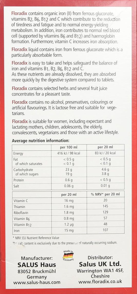 Floradix Liquid Iron Formula - Natural Iron Supplement 500ml Bottle