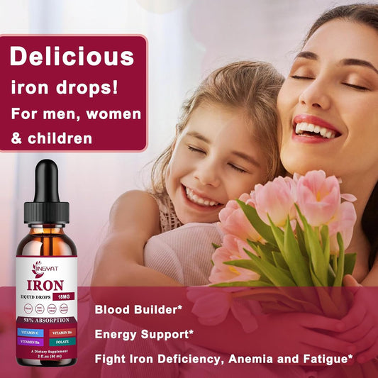 Organic Iron Drops Supplement with Vitamin C for Energy & Blood Support - 18mg Liquid Iron with Folate & B Vitamins - Raspberry Flavor - Men, Women, Kids