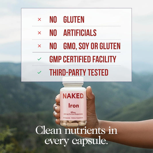 High Potency Iron Supplement for Energy Support - Naked Nutrition Iron 65mg, 325mg Ferrous Bisglycinate Capsules - Non-GMO & Gluten-Free - Promotes Healthy Red Blood Cells - 60 Count