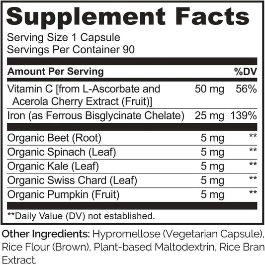 Organic Vegan Iron Supplement with Vitamin C and Whole Foods - Gentle Iron Pills for Women & Men with Pregnancy, Anemia Diets - 90 Mini Capsules