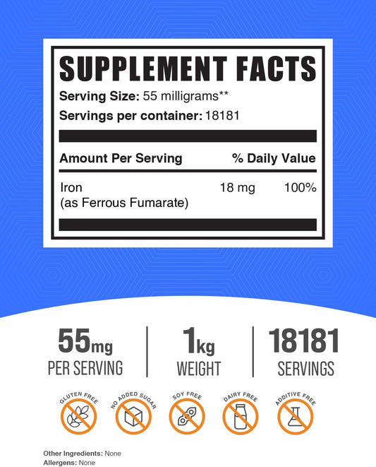 BulkSupplements.com Ferrous Fumarate Powder - Iron Supplement, 18mg Iron per Serving, Gluten Free, 1kg (2.2 lbs) Pack of 1