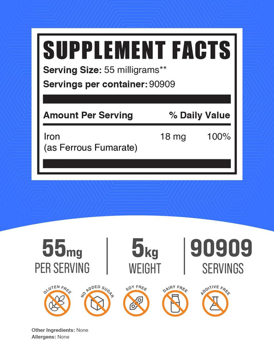 BulkSupplements.com Ferrous Fumarate Powder - Iron Supplement, Essential Mineral, 18mg Iron per Serving, Gluten Free - 5kg (11 lbs) Pack of 5