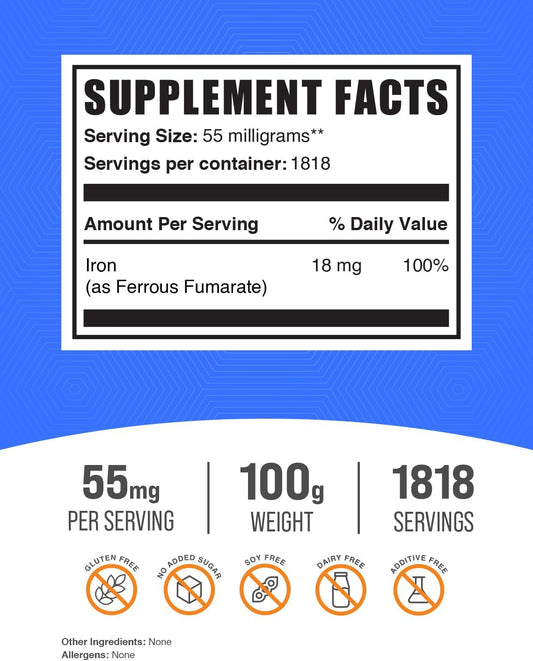 Ferrous Fumarate Powder 100g - Iron Supplement 18mg per Serving - Gluten-Free Iron Mineral - BulkSupplements.com