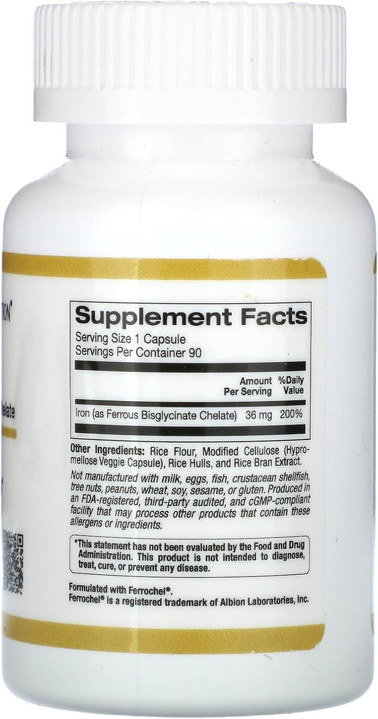 Gentle on the Stomach Iron Supplement 36mg, 90 Veg Capsules, Ferrochel Ferrous Bisglycinate Chelate by California Gold Nutrition