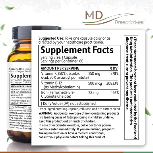 Iron MD Capsules: Daily Iron Supplement with Vitamin C, B12 & Folic Acid - 60 Veg Capsules for Men & Women - Optimal Absorption Formula