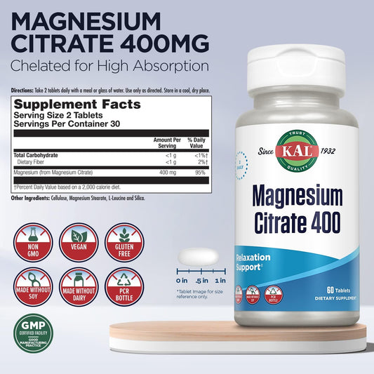 400mg Magnesium Citrate Supplement for Healthy Muscles, Nerves, and Circulation - 60 Tablets, Vegan & Gluten Free
