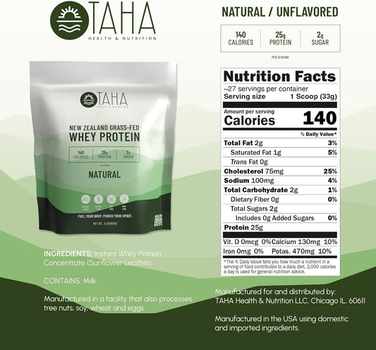 2LB Taha Health & Nutrition Natural Unflavored Whey Protein Concentrate Powder - 25g Protein, 140 Calories - Grass-Fed, Free-Range Dairy - Keto, Kosher - Gluten and Soy Free