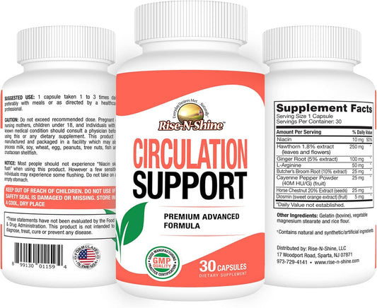30 Count Rise-N-Shine Circulation Support Supplement with Hawthorn Extract, Ginger Root, L-Arginine for Enhanced Blood Flow