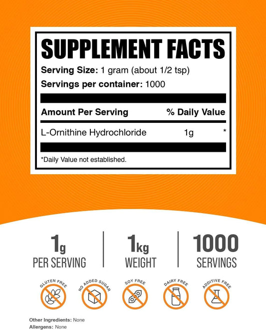 BulkSupplements.com L-Ornithine HCl Powder - High Quality Ornithine Supplement, 1000mg per Serving, Gluten Free, 1kg - Amino Acid Powder