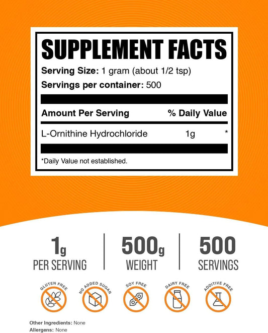BulkSupplements.com L-Ornithine HCl Powder - Amino Acids Supplement, 1000mg per Serving, 500g (1.1 lbs) - Gluten Free, Pack of 1
