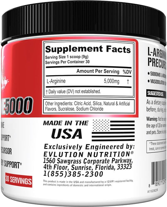 High Potency L-Arginine Supplement for Enhanced Pumps, Energy, Muscle Growth, and Vascularity - 5000mg Nitric Oxide Booster by Evlution Nutrition