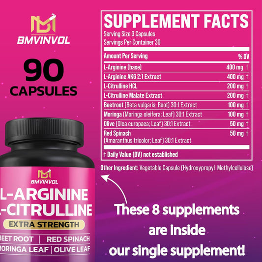 Energy Boosting L Arginine and L Citrulline Supplement with Beet Root, Moringa, Olive, Red Spinach - 90 Capsules
