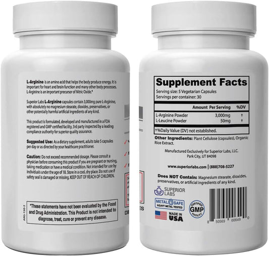 High-Quality L-Arginine Supplement - 3,000mg Dosage - 150 Veg Capsules - Supports Vasodilation, Energy, Cardio Health