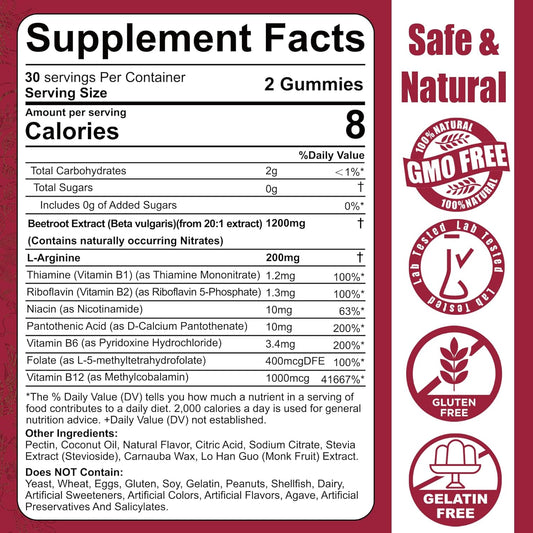 Organic Beet Root Gummies with L-Arginine 1400mg for Energy, Blood Flow & Circulation - Vegan, Non-GMO, 120 Count