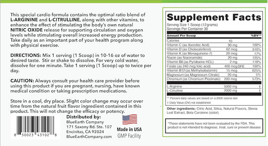 BlueEarth Company Nitric Oxide Booster Powder Supplement - L-Arginine & L-Citrulline Complex for Heart Health, Energy & Endurance - 30 Servings - Pineapple Flavor