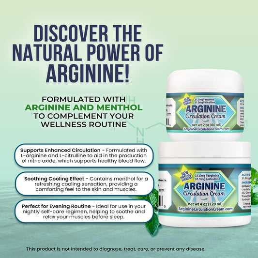 4 oz Arginine Circulation Cream with Menthol, L Arginine & L Citrulline - Promotes Healthy Blood Flow for Legs & Body - Whole Family Products