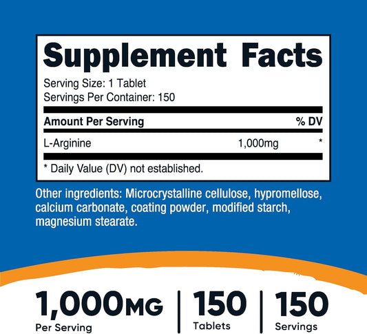 High Quality Nutricost L-Arginine 1000mg Amino Acid Tablets - 150 Count