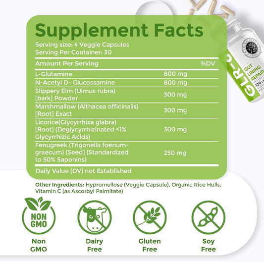Gut Lining Repair Supplement for Intestinal Health - Vegan Gut Repair with L-Glutamine, Slippery Elm, DGL Licorice Root, Marshmallow Root, Fenugreek - IBS, IBD, GERD - Intestinal Fortitude GLR-6