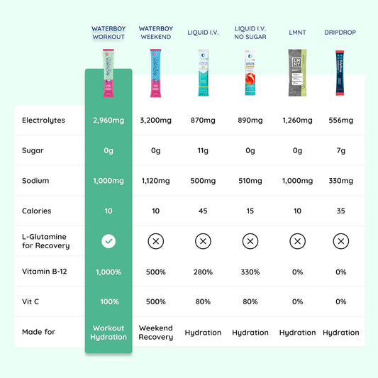 Waterboy Workout Hydration Drink Sticks with L-Glutamine and Vitamins - Sugar Free Electrolyte Powder Packets - Blue Raspberry Flavor - Gluten Free and All Natural - Pack of 15