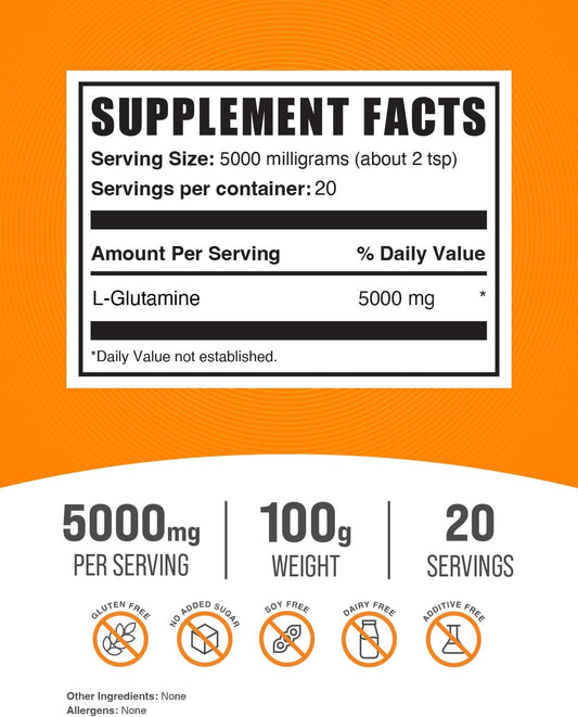 BulkSupplements L-Glutamine Powder - 5000mg Glutamine Supplement, Unflavored, Gluten Free - 100g (Pack of 1)