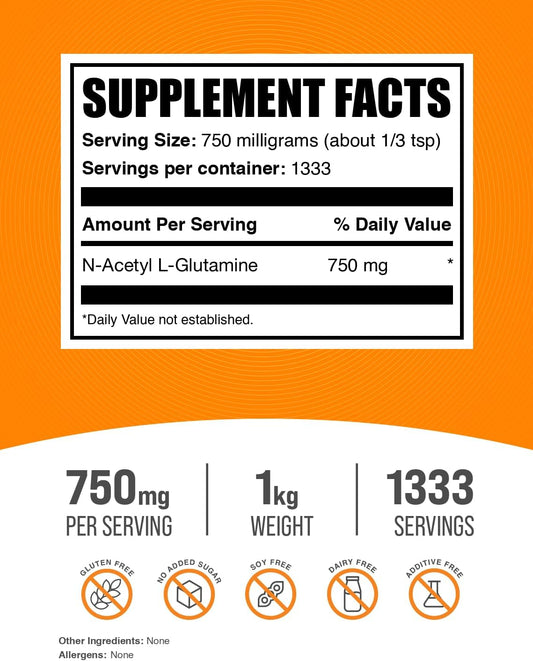 BulkSupplements.com N-Acetyl L-Glutamine Powder - Gut Health & Recovery Supplement, Gluten Free, 1kg (2.2 lbs) (Pack of 1)