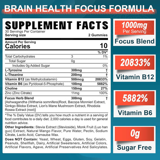 2 Packs of NEVISS Sugar-Free L-Tyrosine Gummies with Brain Health Herbs and Vitamins for Sustained Focus and Energy