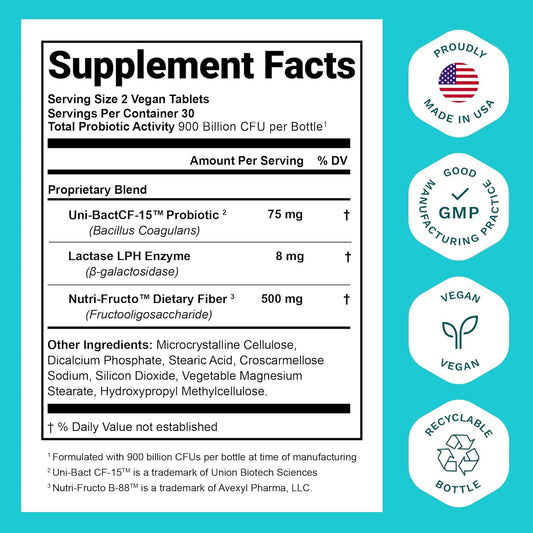 Premium Probiotic Supplement with Lactase Enzyme and Prebiotic Fiber - Boost Digestive Health for Women and Men - Vegan Formula, Made in USA