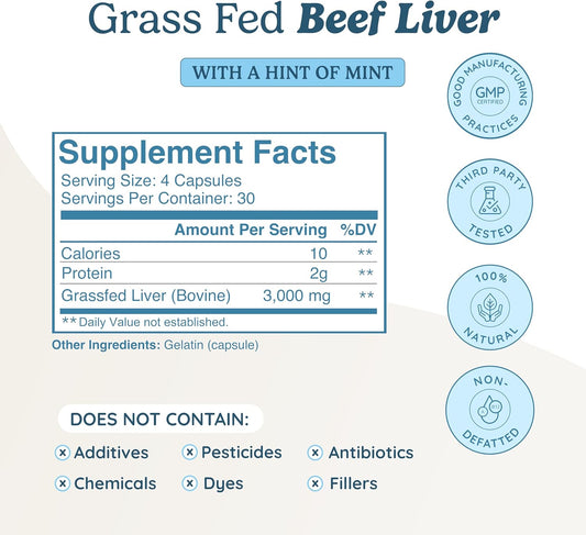 3000mg Grass Fed Beef Liver Capsules - Pasture Raised Desiccated Supplement for Energy, Immunity, and Liver Support - Iron-Rich Beef Organ Supplement for Men and Women (30 Servings)