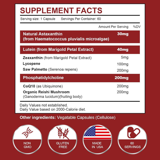 130mg Astaxanthin and Lycopene Supplement with Phosphatidylcholine, Lutein, Zeaxanthin - 180 Capsules