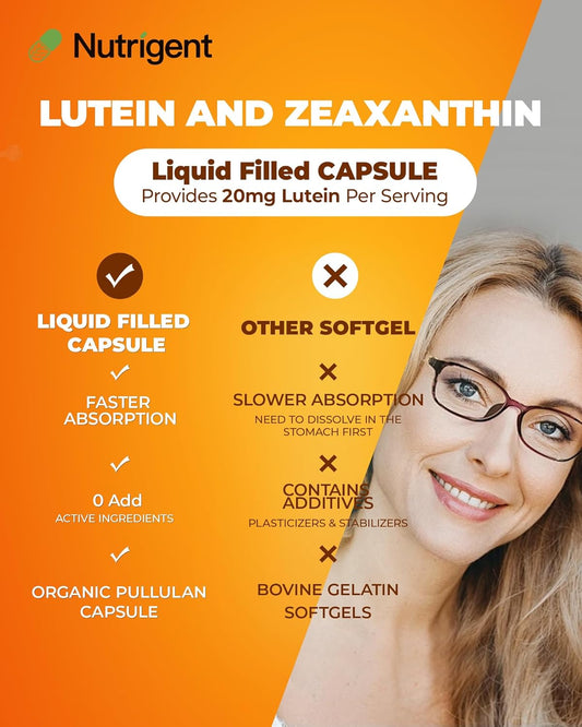 Organic Liquid-Filled Lutein 20mg Capsules with Zeaxanthin for Vision Health - Gluten & Soy-Free Eye Health Supplement (60ct)