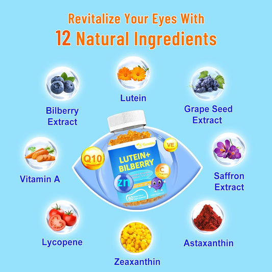 Lutein & Zeaxanthin Gummies with Bilberry, Astaxanthin, Omega 3, Vitamin C, E - Eye Health Supplement for Adults & Kids - Dry Eye Relief, Vision Clarity, Macular Support - VZOXAINS 20mg