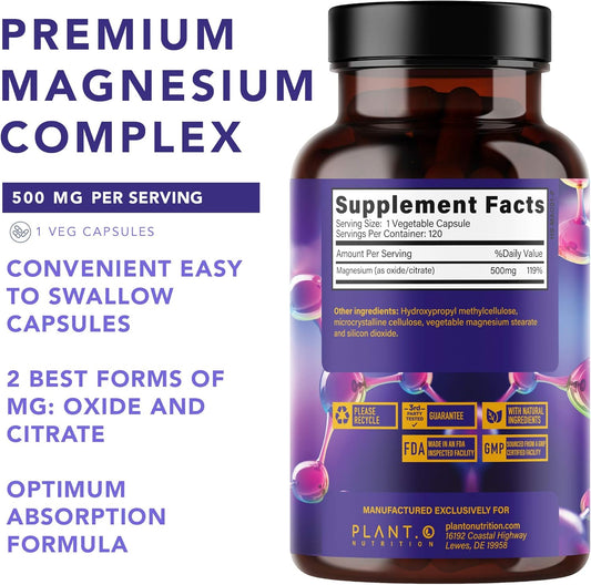 Plant.O Premium Magnesium Supplement 500mg - Vegan Oxide & Citrate for Sleep, Calm, Muscle Relaxer, Natural Energy - Non-GMO, High Absorption Complex - 120 Veggie Capsules