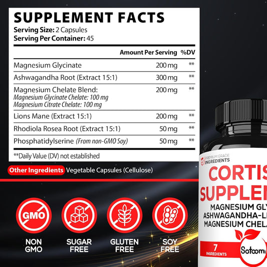 7in1 Cortisol Supplement with Magnesium Glycinate and Ashwagandha - Mood Support, Rest, and Resilience - 90 Capsules for 45 Days