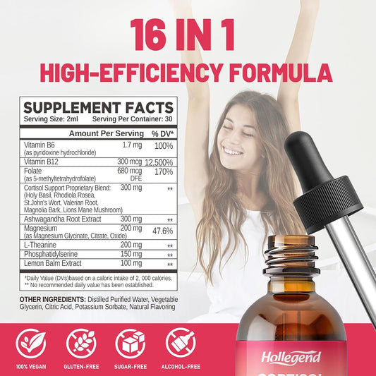 HOLLEGEND Cortisol Reducing Liquid Drops for Women - 16-in-1 Supplement with Ashwagandha, Magnesium, L-Theanine, Folate - Promotes Relaxation and Hormone Balance - Strawberry Flavor