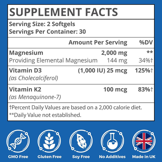 High Absorption Liposomal Magnesium 2000mg Capsules with Vitamin D3 & K2 for Brain, Memory, Bone, and Muscle Support - 60 Count for Men and Women