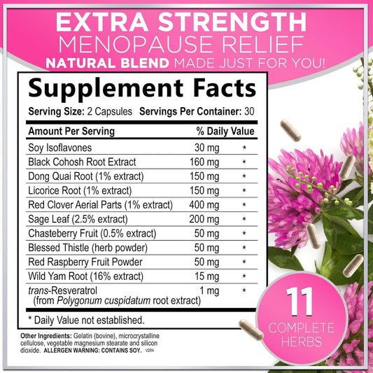 Menopause Relief Supplement with Black Cohosh, Soy Isoflavones, Don Quai - Hot Flash & Night Sweats Relief - Non-GMO Women's Menopause Supplements, 60 Capsules