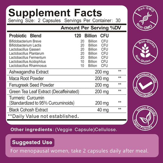 MOHOKEN Menopause Relief Supplements for Women - 120 Billion CFU Probiotic + 13 Herbs Complex - Hormone Balance, Hot Flashes, Mood Swings, Night Sweats - 60 Capsules