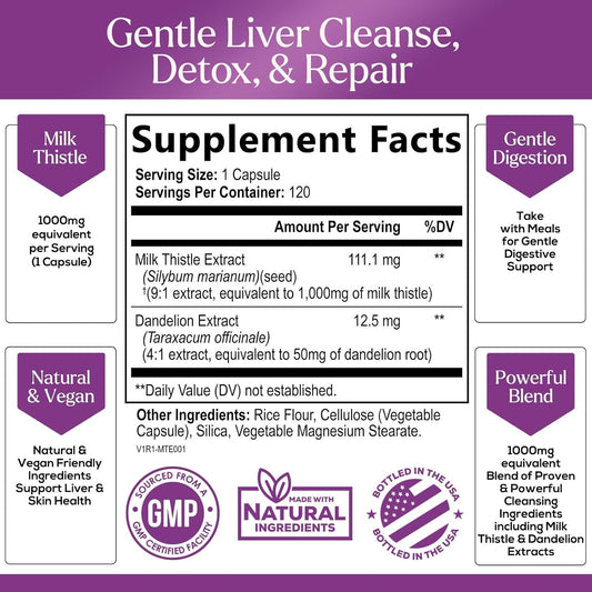Advanced Liver Cleanse Detox & Repair Supplement - 1000mg Herbal Liver Support Formula with Silymarin Marianum - Nature's Nutrition Liver Health Support - 120 Capsules